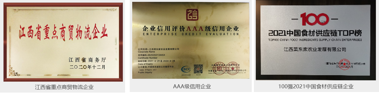 菜東家先后獲得“江西省服務業(yè)龍頭企業(yè)”、“江西省電子商務示范企業(yè)”、“江西省重點商貿(mào)物流企業(yè)”、“江西省農(nóng)業(yè)產(chǎn)業(yè)化省級龍頭企業(yè)”、“2023年度中國食材供應鏈TOP100”、“江西省物聯(lián)網(wǎng)示范基地(企業(yè))”、“2023年度新余市社會責任企業(yè)”、“2024年數(shù)據(jù)要素X大賽江西分賽現(xiàn)代農(nóng)業(yè)賽道三等獎”、獎“2025年省數(shù)據(jù)要素企業(yè)X大賽分賽決賽中現(xiàn)代農(nóng)業(yè)賽道二等獎”等榮譽。