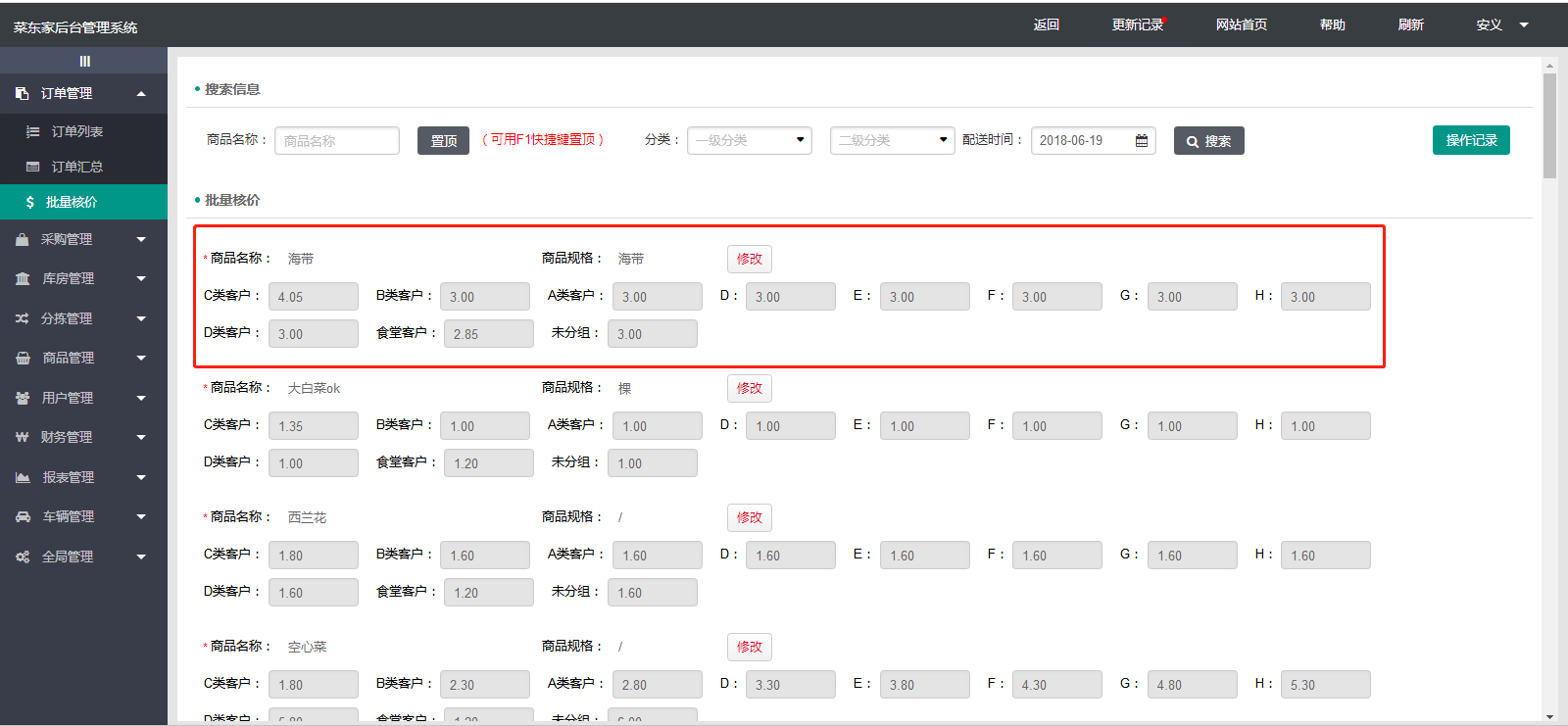 批量核價(jià)修改成豎列排版,解決客戶分組多排版不下的問題;