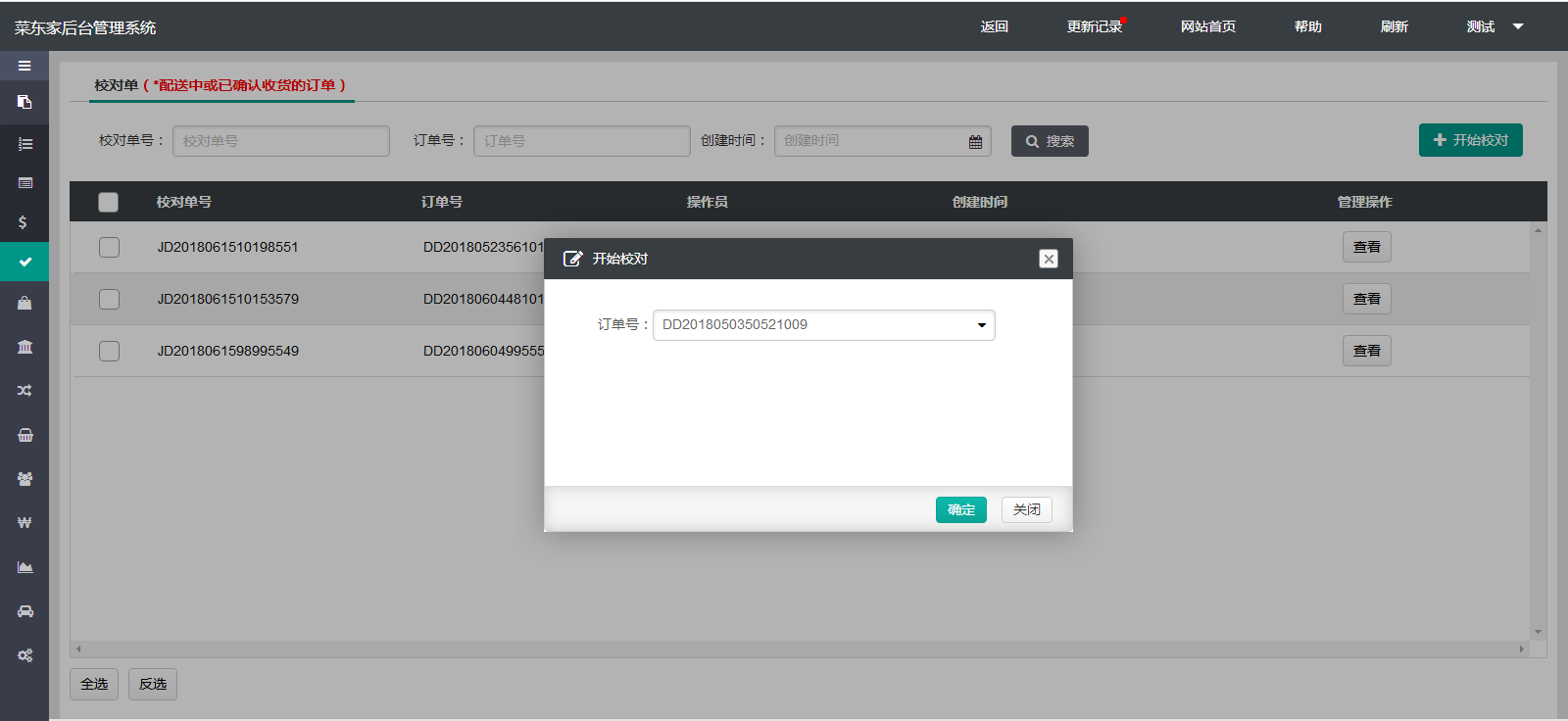 增加訂單校對(duì)功能。點(diǎn)擊開始校對(duì),輸入訂單號(hào)即可。校對(duì)只針對(duì)數(shù)量和價(jià)格修改。(注:校對(duì)功能適用于配送中和配送完成的訂單)