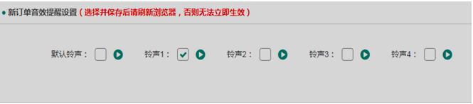 為更好的滿足大家對訂單的及時了解,不至于遺漏和疏忽,在全局管理的項目管理下,增加了新訂單鈴音提醒,設(shè)置了五種鈴音供選擇,選擇后保存并刷新,即生效。再有新訂單生成,就會有鈴聲及時提醒,避免了疏漏。
