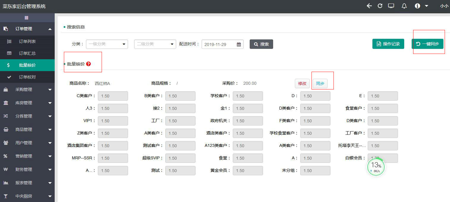 2、為了使每天菜品價格貼近市場的真實,在訂單管理系統(tǒng)的“批量核價”功能項中新增“一鍵同步”。 即:每次核價完成后,當(dāng)前配送時間下的訂單商品價格會自動改變,商品也會自動加上或改變報價公式;當(dāng)要修改的目標(biāo)值與框內(nèi)的值相同時,系統(tǒng)不會自行執(zhí)行操作, 如果確認(rèn)無誤目標(biāo)值與框內(nèi)的值一樣時,就點擊“同步”按鈕即為核實;如果有出入,就點擊“修改”處理。