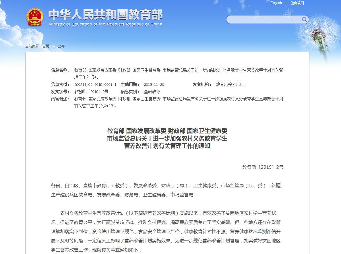 2019年11月20日教育部 國家發(fā)展改革委 財政部 國家衛(wèi)生健康委 市場監(jiān)管總局發(fā)布教督函〔2019〕2號《關(guān)于進(jìn)一步加強(qiáng)農(nóng)村義務(wù)教育學(xué)生營養(yǎng)改善計劃有關(guān)管理工作的通知》 。進(jìn)一步強(qiáng)化規(guī)范營養(yǎng)改善計劃管理,加快學(xué)校食堂建設(shè),完善食堂設(shè)施設(shè)備配備,大力推進(jìn)食堂供餐,強(qiáng)化食品安全管理,嚴(yán)格落實學(xué)校負(fù)責(zé)人陪餐制度,打造“透明廚房”,嚴(yán)格資金使用管理,主動接受媒體和社會監(jiān)督,加強(qiáng)營養(yǎng)健康教育,引導(dǎo)學(xué)生養(yǎng)成健康飲食習(xí)慣。