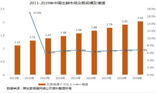 隨著生活水平的提高,生鮮食品逐漸成為人們日常生活中的高頻剛需產品。由于“高頻”和“剛需”兩個特點,生鮮食品在我國消費者食品支出占近半成比重,加上我國龐大的人口基數(shù),國內生鮮市場容量巨大,并呈逐年穩(wěn)定上升的趨勢。據(jù)電子商務產業(yè)權威調研機構艾媒咨詢公布的數(shù)據(jù)顯示,2019年中國生鮮市場交易規(guī)模超兩萬億元,達到2.04萬億元,同比增長6.8%,中國生鮮類消費市場在零售消費市場中的重要地位不言而喻。自2011年以來,中國生鮮市場交易規(guī)模持續(xù)穩(wěn)定增長,漲幅保持在6%以上。