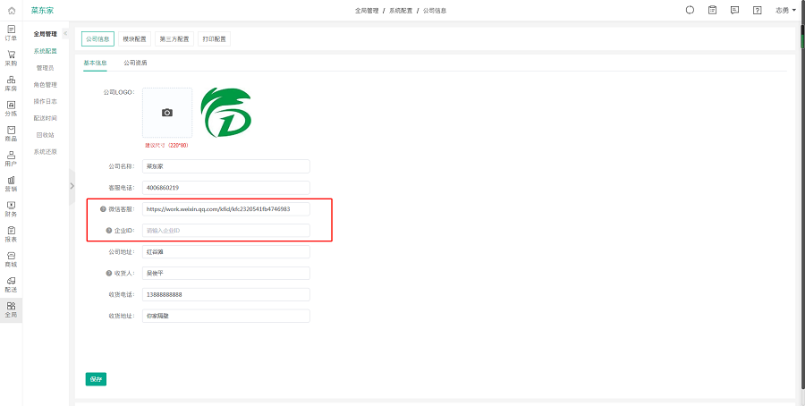 首先,在系統(tǒng)后臺(tái)全局管理的系統(tǒng)配置欄目中,點(diǎn)擊公司信息進(jìn)行微信客服的設(shè)置