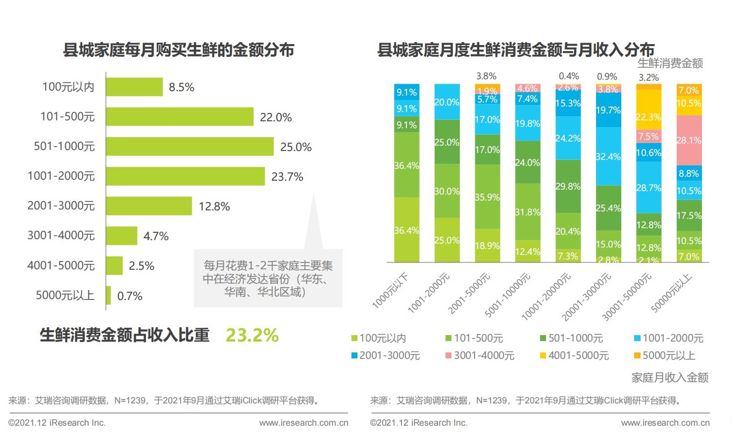 生鮮作為老百姓的剛需商品,幾乎是每日必不可缺的。數(shù)據(jù)顯示,縣城居民每月購買生鮮的消費(fèi)金額占收入比重達(dá)23.2%。